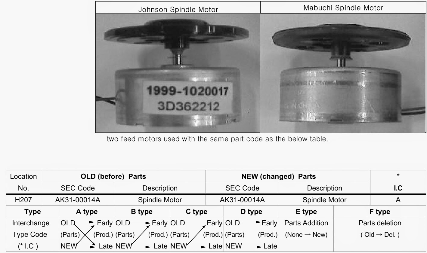 SVC Action - use a feed motor which is manufactured by Mabuchi to repair the defective unit.