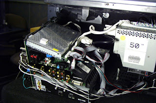 The 2H and 2.14H external inputs along with sync are applied to connector BV402. Next it is applied to the BEP (Back End Processor) for processing into an analog RGB signal. The NTSC and the ATSC analog video signal (2H) from the DM2CR is applied to connector BV401. The video is also applied to IV401 for conversion to RGB. The RGB output from IV401 is then applied to the Analog to Digital (A/D) converter IW601. It’s output is 8 bit digital red, green and blue video data stream. This digital video is next applied to the Lun-IC, IW701. IW701 converts the three separate digital video streams to a 48 bit 720P digital RGB signal. This 48 bit signal is then processed by the FPGA IC IW801. The output from IW801 is a 24 bit 720P signal that the DVI transmitter can use. The DVI transmitter IW901 converts the 24 bit signal to the DVI format. These outputs exit the formatter circuit board via connector BW901 and are sent to the light engine’s DVI receiver. The DVI transmitter and receiver incorporate HDCP (High Bandwidth Digital Content Protection. The HDCP encryption format covers all high bandwidth applications such as computers, DVD players and HDTV (ATSC). Whenever the connector BW901 is disconnected the DVI transmitter turns off. This is done to protects against and prevents any video pirating.