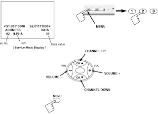 While pressing the MENU button on the television, press the Number Key 3 on the remote control unit. The Service Menu now appear.