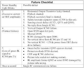 The number of times the Timer/Standby light blinks indicates what failure the Control Tuning System Microprocessor IC001 detects. IC001 will shut off or blank the TV set to protect itself. The Standby/Timer light will continue to blink as long as the TV is plugged into AC power.
