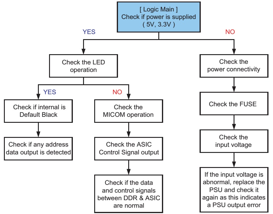 - If the screen is abnormal, even though the Vref voltage is normal, check if there is a short circuit by conducting a short-circuit test. If a short-circuit is found, repair it. If the short-circuit is an internal one, replace the board.