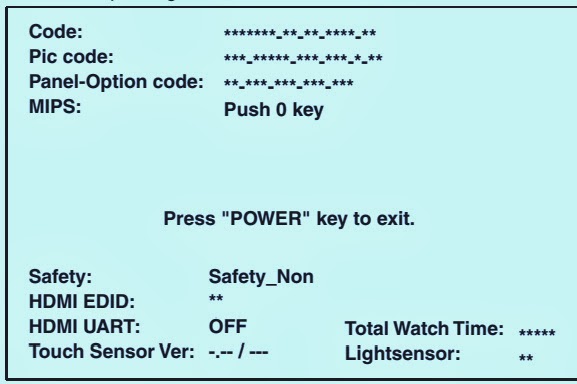 Turn the power on.Press [0], [6], [2], [5], [9], [6], and [INFO] buttons on the remote control unit in this order. The following screen appears.