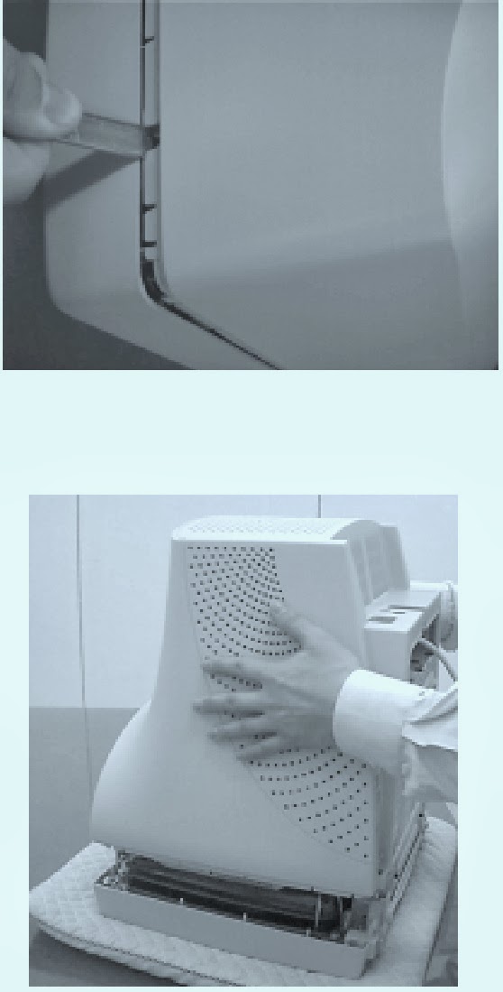 - Push the Opening jig in to each groove along the top of the monitor until makes a “tak” sound. (2 grooves: Left and Right, Make sure each snap is disengaged.)