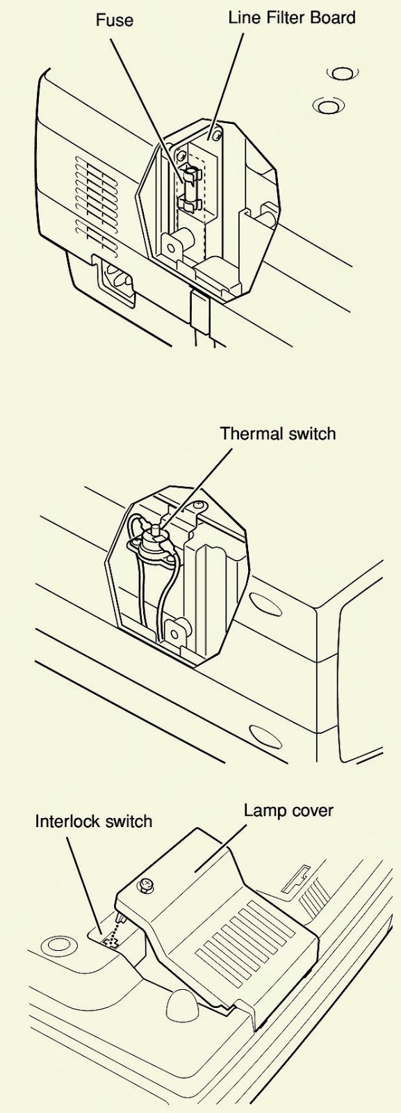 There is the thermal switch (SW905) inside of the projector to prevent the internal temperature rising abnormally. When the internal temperature reaches near 90˚C, turn off the AC main power supply automatically.