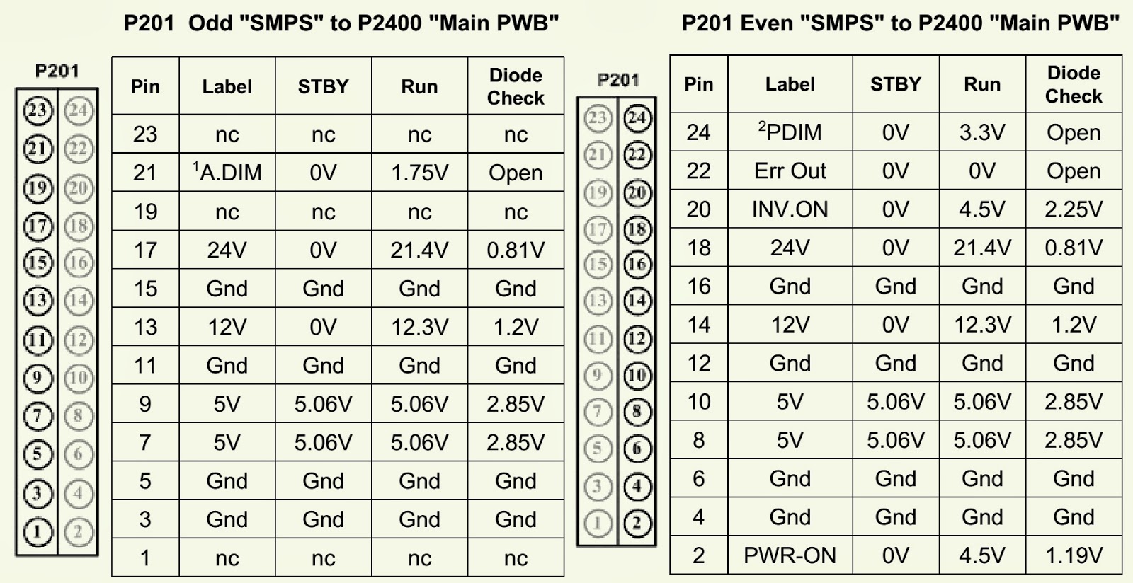 a) The SMPS PWB “MUST” be producing STBY 5V on all of the pins 7, 8, 9 or 10 (5V). If 5V Standby is not being generated, the SMPS PWB is defective and must be replaced. There is no need to continue with the next test.