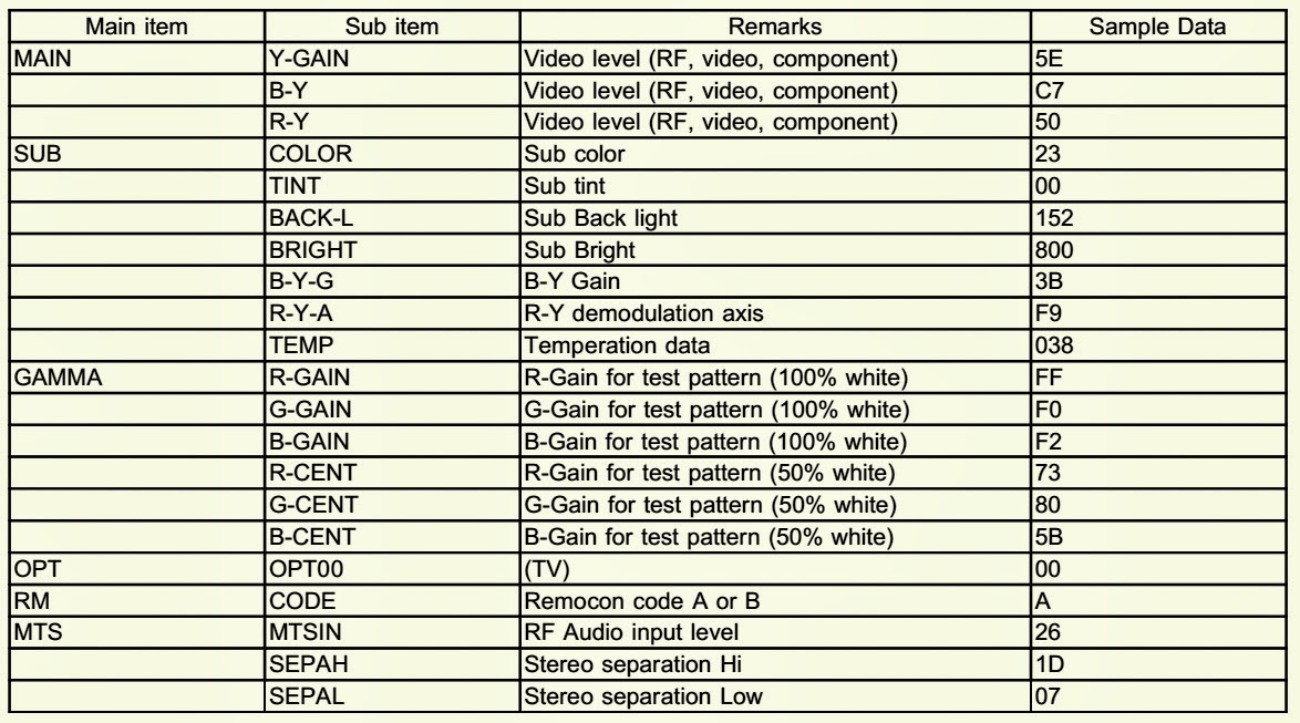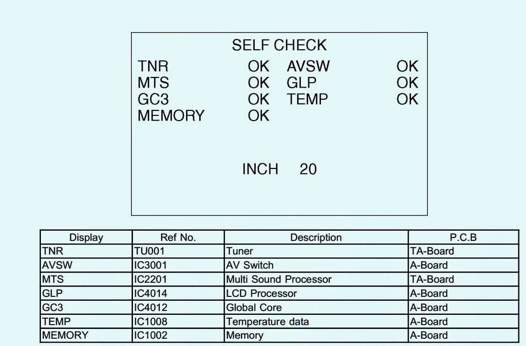 When phenomena like "the power fails from time to time" or "the video/audio fails from time to time" can not be confirmed at the time of servicing, the self-check function can be used to confirm the occurrence and to limit the scope for the defective circuits.Also, when "the power fails from time to time", display on the screen can be used to confirm the occurrence and to limit the scope for the defective circuits. Any programmed channels, channels caption data and some other user defined settings will be erased and return to factory setting.